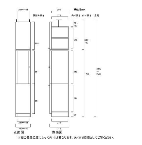 半透明扉付スリムストッカー高さ241〜250cm幅30〜44cm奥行31cm厚棚板(棚板厚2.5cm)(高さ=ラック高さ178cm+突っ張り棚高さ56cm+伸縮突っ張り金具)半透明片開き扉半透明扉付スリムストッカー