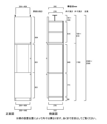 半透明扉付スリム食器棚高さ250〜259cm幅30〜44cm奥行31cm(高さ=ラック高さ178cm+突っ張り棚高さ65cm+伸縮突っ張り金具)半透明片開き扉半透明扉付スリム食器棚