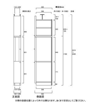 商品仕様 ■棚板タイプ: 厚棚板(厚さ2.5cm)タイプ ■棚板耐荷重: 15Kg ■外寸: 奥行40cm×高さ241〜250cm×幅15〜24cm (幅は1cm単位でオーダーできます) ■対応天井高: 241〜250cm (ラック高さ178cm+突っ張り棚高さ56cm+伸縮突っ張り金具) ■棚板枚数 移動固定棚板:7 ■扉枚数:本体棚 2枚(上下分割扉)、突っ張り棚 1枚 片開き(左開き/右開き) ■半透明扉部分素材: フレーム部分/MDF 樹脂部分/ポリスチレン ■付属品: 突っ張り金具・転倒防止補助バンド・扉取付用ヒンジ・取っ手用金具(標準つまみ)・ビス ■外寸(幅): 15cm 16cm 17cm 18cm 19cm 20cm 21cm 22cm 23cm 24cm 共通仕様 ■材質: プリント化粧繊維板 ■塗装: ウレタン樹脂塗装 ■素材: ホルムアルデヒドの発生を最小限に抑えた基材・芯材・プリント紙・接着剤(F☆