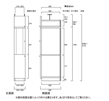 奥深キッチンスリムストッカー高さ208〜217cm幅15〜24cm奥行46cm(高さ=ラック高さ178cm+突っ張り棚高さ23cm+伸縮突っ張り金具)半透明片開き扉奥深キッチンスリムストッカー
