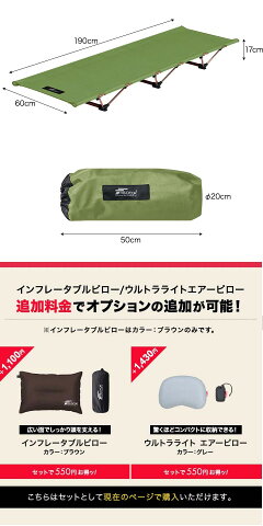 選べる枕付きセットも ・広い面でしっかり支えるインフレータブルピロー ・驚くほどコンパクトなウルトラライトエアーピロー ブランド: フィールドア(FIELDOOR) カラー: ・カーキ ・コヨーテ ・オリーブ サイズ: 使用時 : (約)190cm×60cm×17cm 収納時 : (約)直径20cm×50cm 重量: (約)2.8kg 材質: 生地 : ポリエステル65%、コットン35% フレーム : 超々ジュラルミン (A7075系) 耐荷重: 150kg 特記事項: 部分的に強い力が掛かるように座ったり、座面の上に立ったり飛び跳ねたりしないでください。