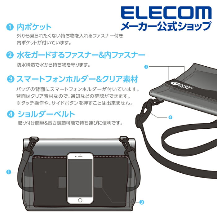 ■カラー:ブラック■材質:本体:PVC ショルダーベルト:ポリエステル ■付属品:ショルダーベルト■その他:バッグ本体寸法:約幅290×高さ195×奥行き25mmエレコムダイレクトショッププールなどの水辺のレジャーで荷物を水から守る。