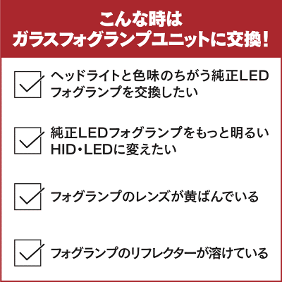 ■商品説明■ 【純正LEDフォグ車のフォグ交換できる!】 バルブ形状のない純正LEDフォグ車でも、純正フォグユニットをガラスフォグランプユニットに交換することでHID・LEDへの交換が可能になります。